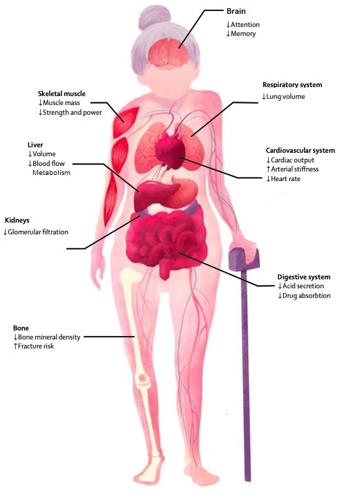 Cardiovascular functions: Even in healthy individuals there is thickening and stiffening of the large arteries. This is why maintaining a good blood pressure through a healthy diet becomes even more important as we age. Aerobic capacity also declines but that makes exercise for at least 120 minutes per week even more important for heart health.